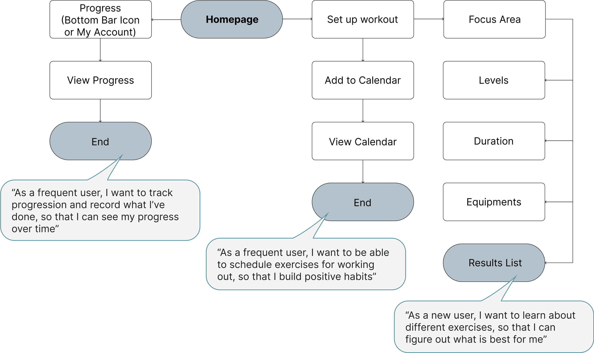 Next, I crafted User Flows to understand how end users would complete their goals. I sampled User Stories to make the flows as realistic as possible.