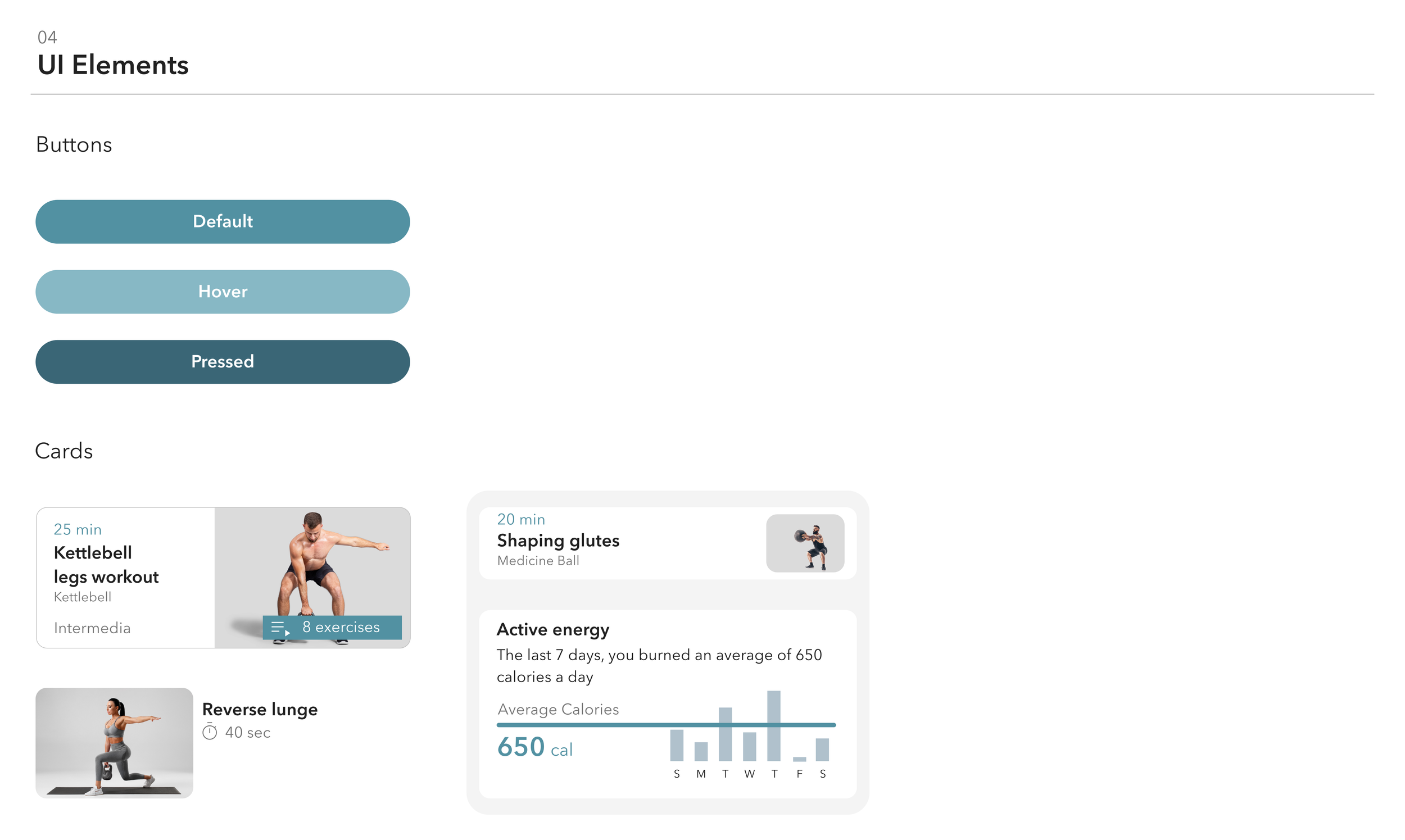 I chose a calm, neutral color palette to help focus on exercising. The design does not have many distracting details and provides a better emphasis on the app’s content. My goal for the app was to evoke a feeling of a modern, stylish, clean product that conveys the impression of health, strength, and power.